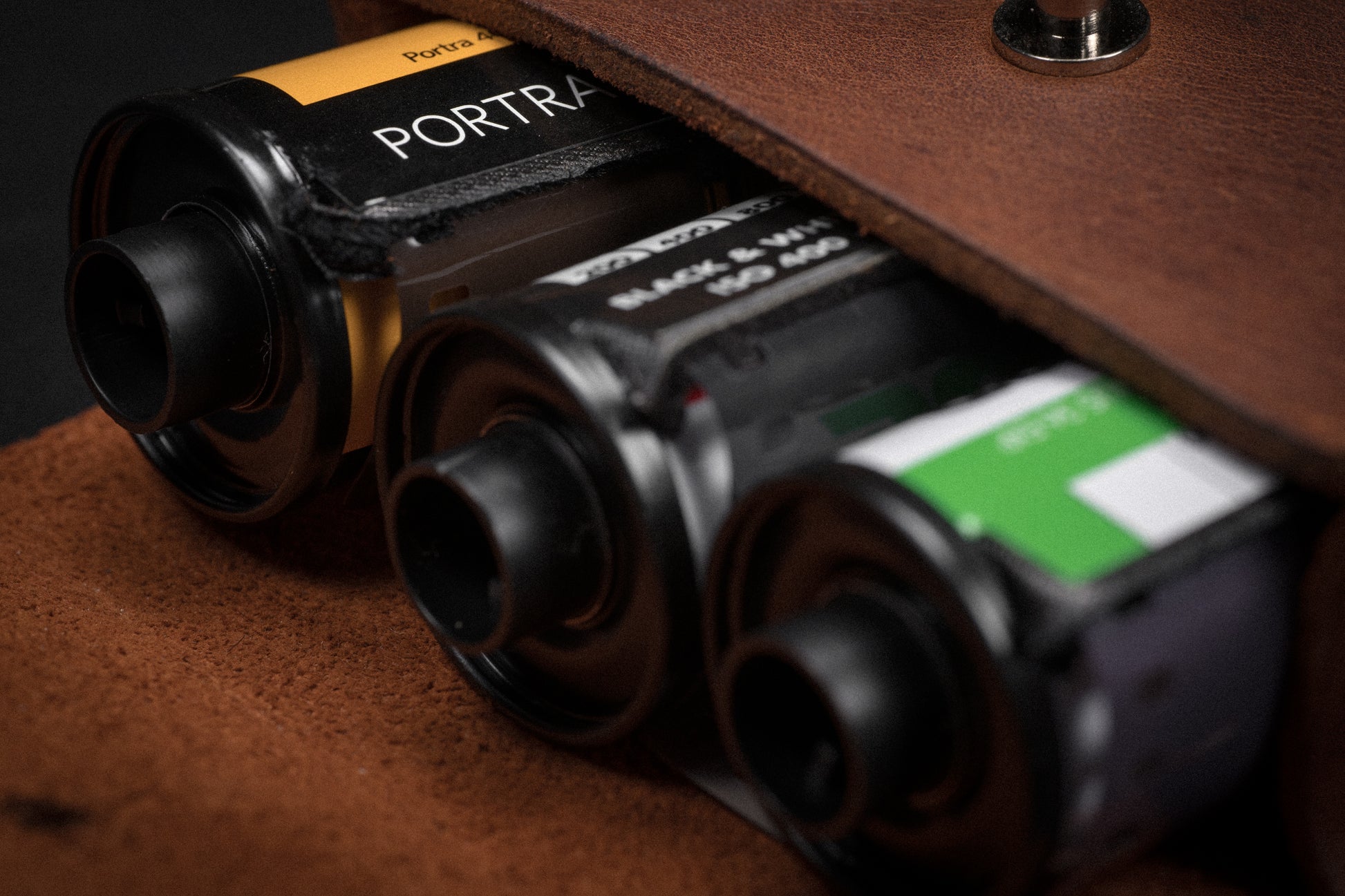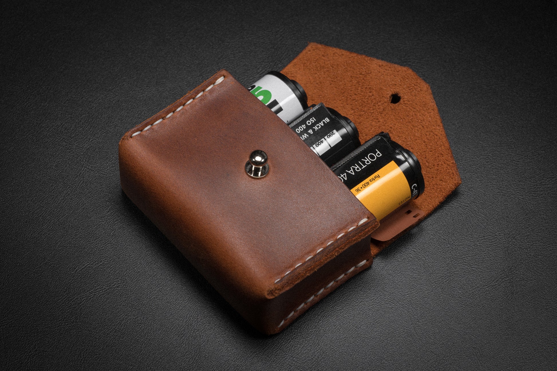 A clean sturdy leather case designed to carry 3 rolls 35mm film.