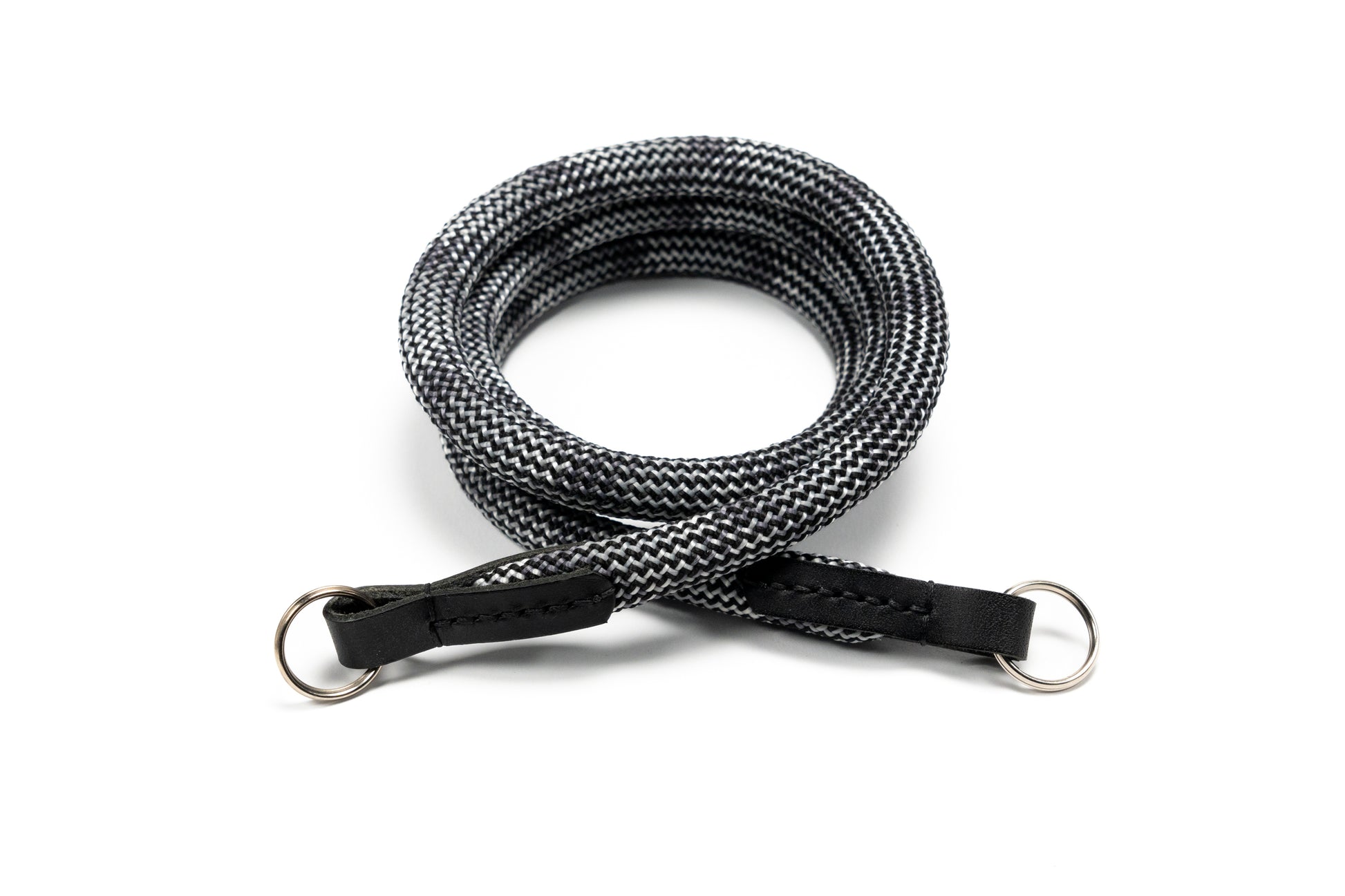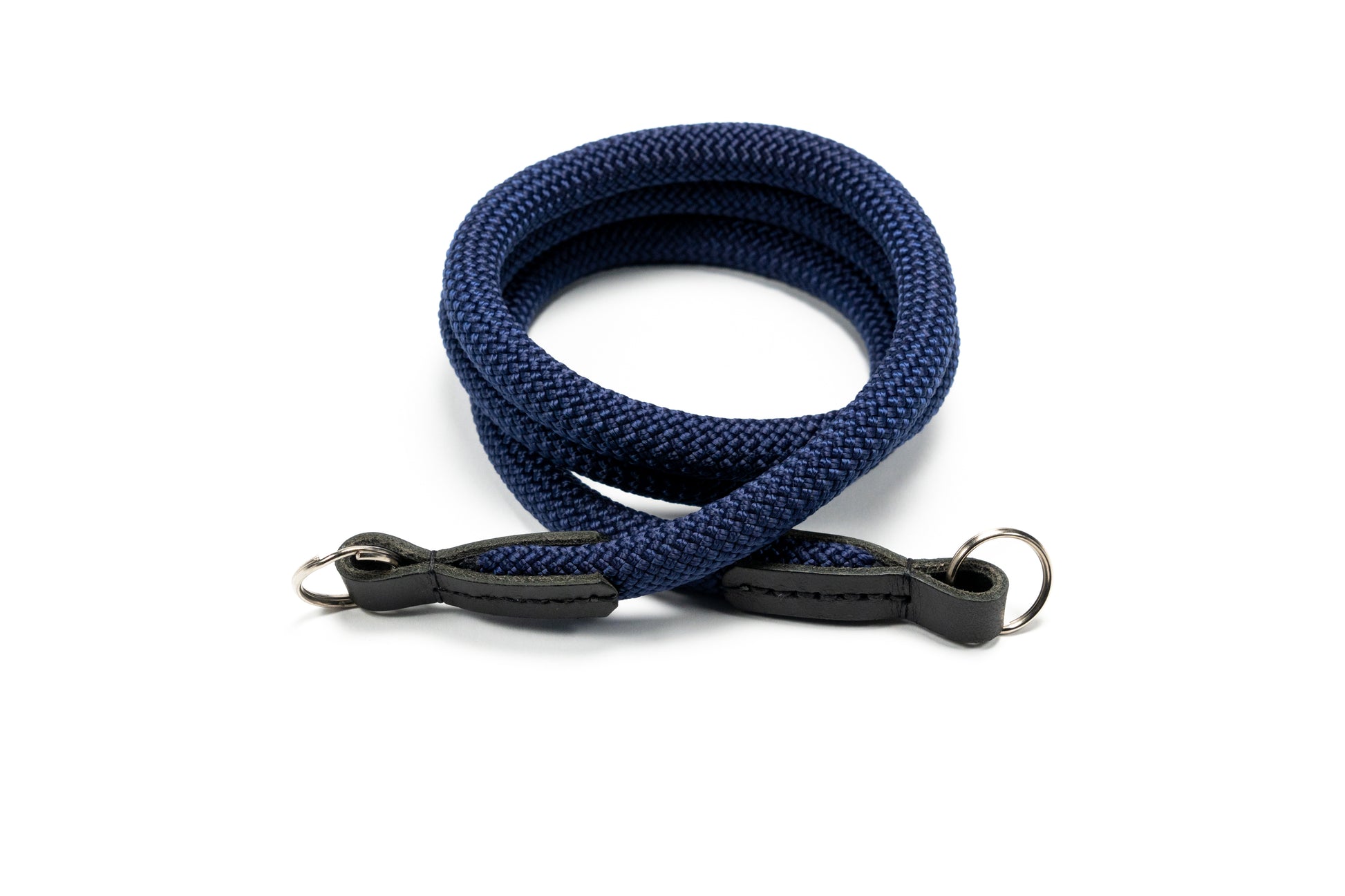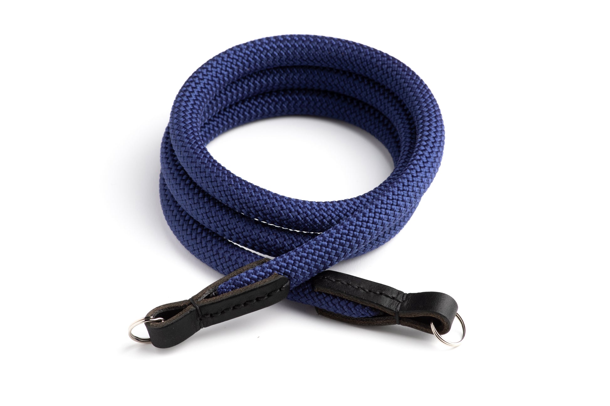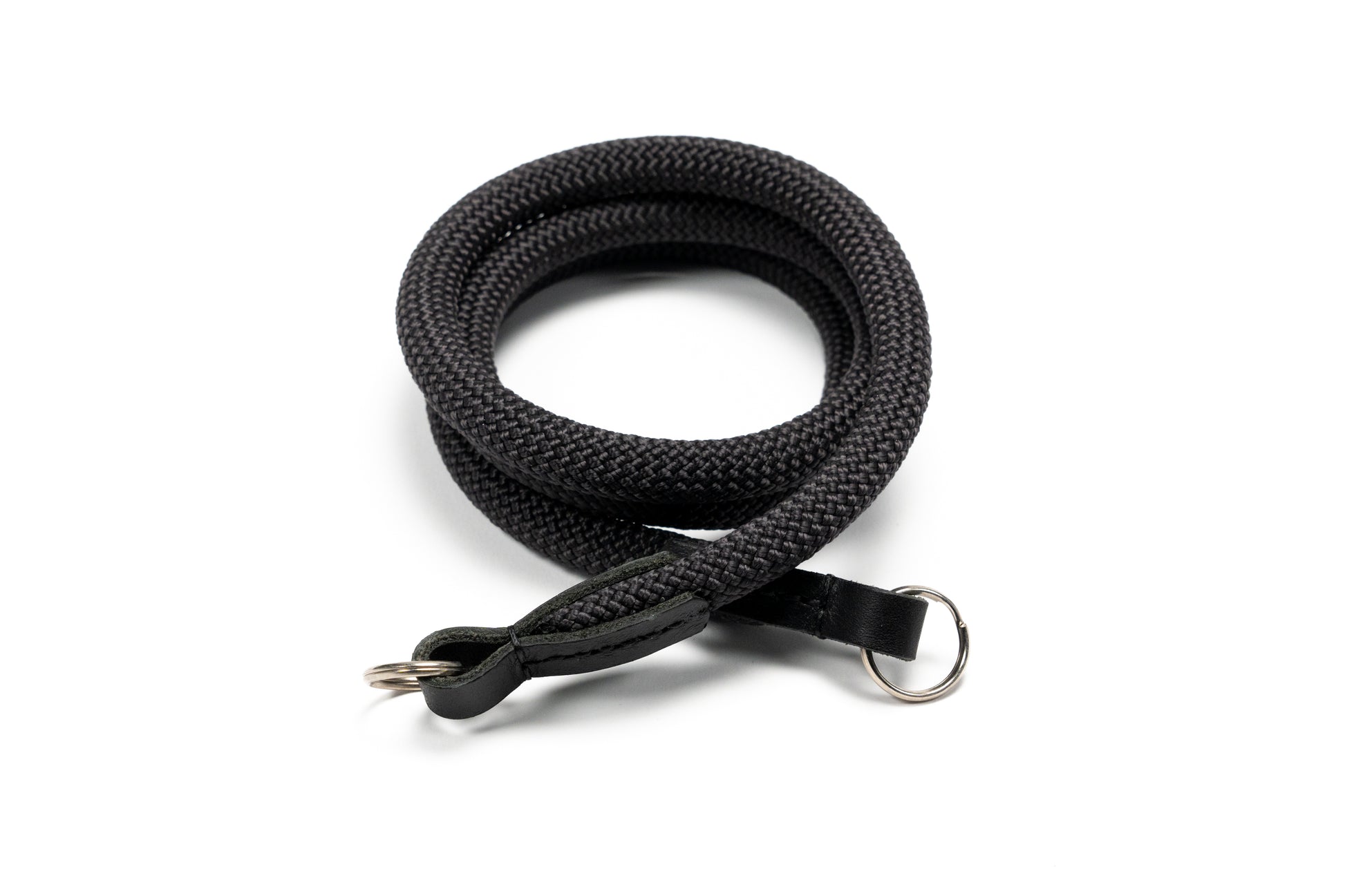 Handmade in Europe from 10mm silk polyester rope finished with 3.5mm black leather ends a 15mm nickel plated key ring camera attachment.