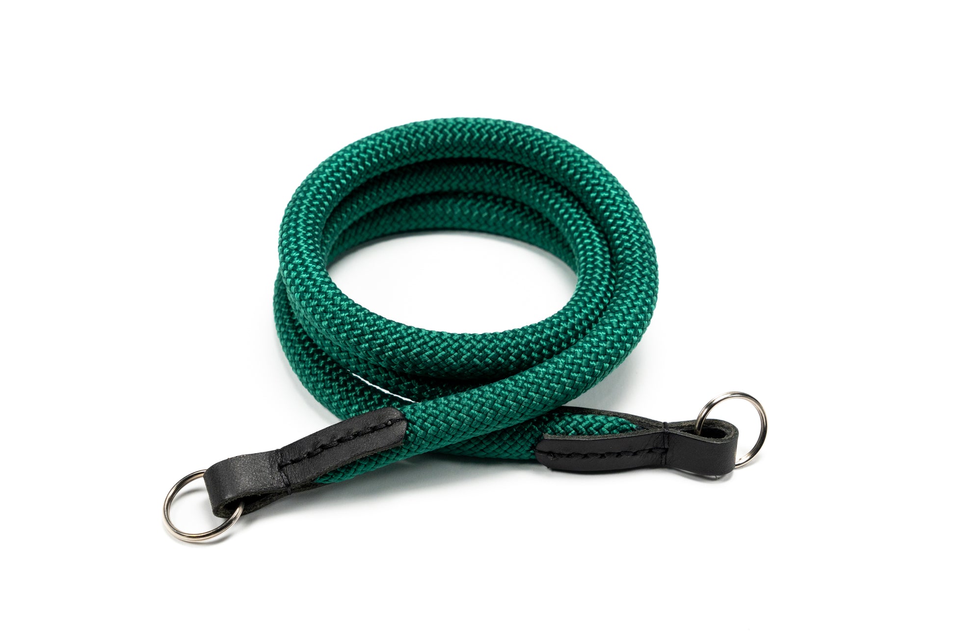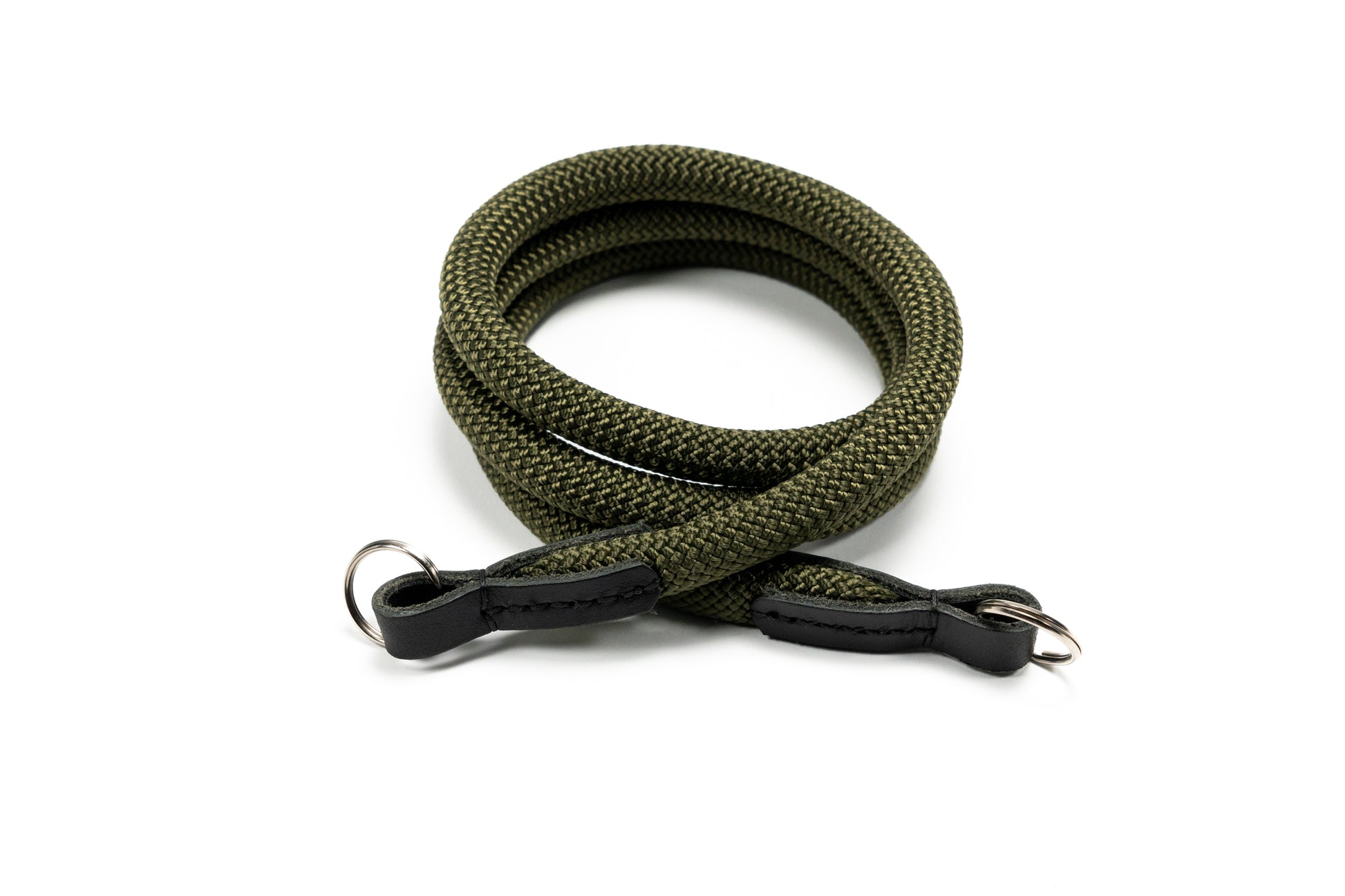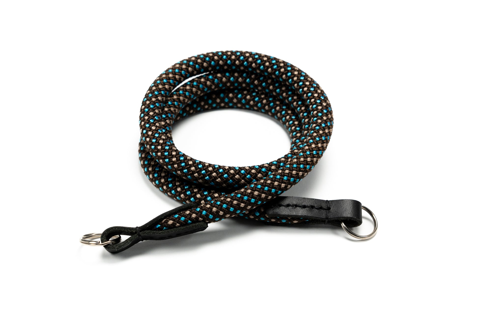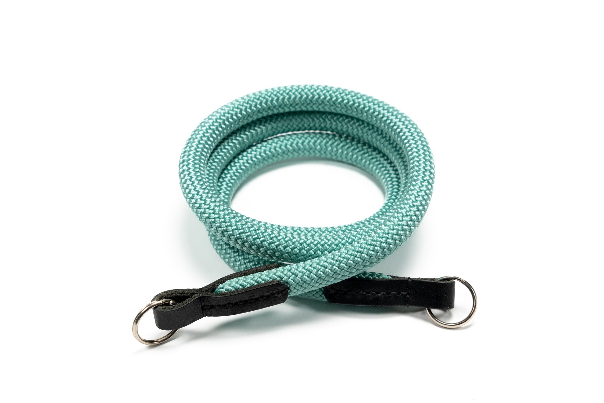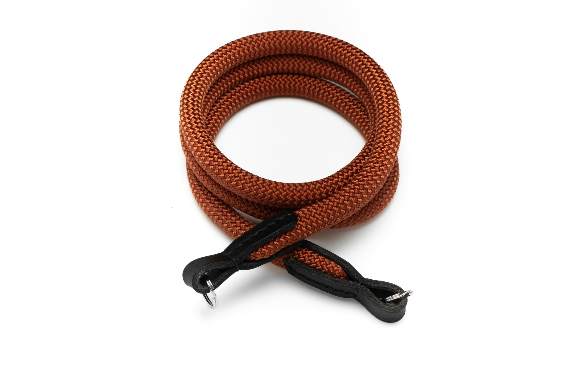 Handmade in Europe from 10mm silk polyester rope finished with 3.5mm black leather ends a 15mm nickel plated key ring camera attachment.